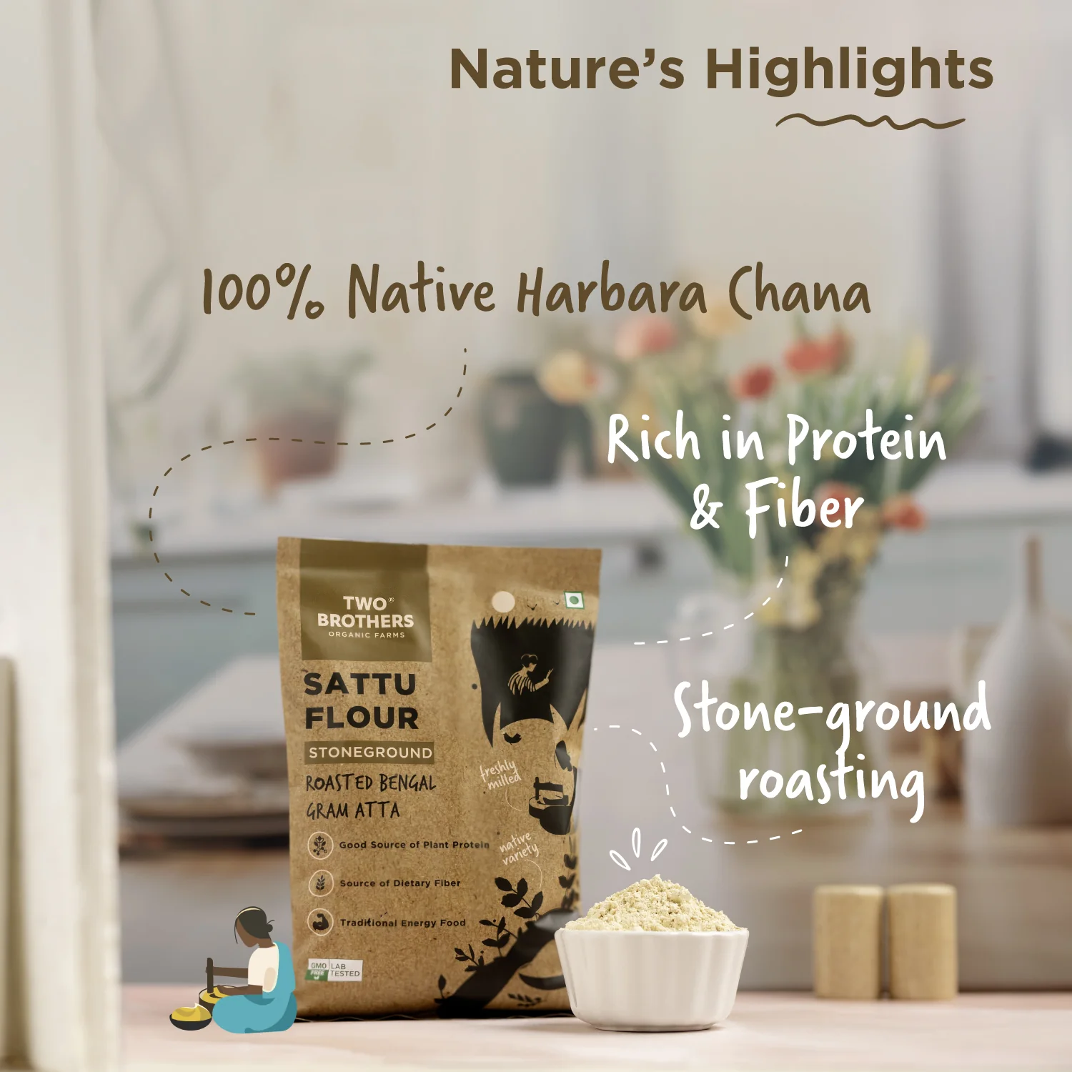 Missing that traditional taste of flavour? With Two Brothers Organic Farms Sattu Atta, your every bite is nothing less than a taste of childhood that feels like homecoming. Made from stone-ground, roasted Bengal gram (Harbara Chana), this flour has been a staple in Indian kitchens for generations, and is known for its instant energy and rich nutritional profile.