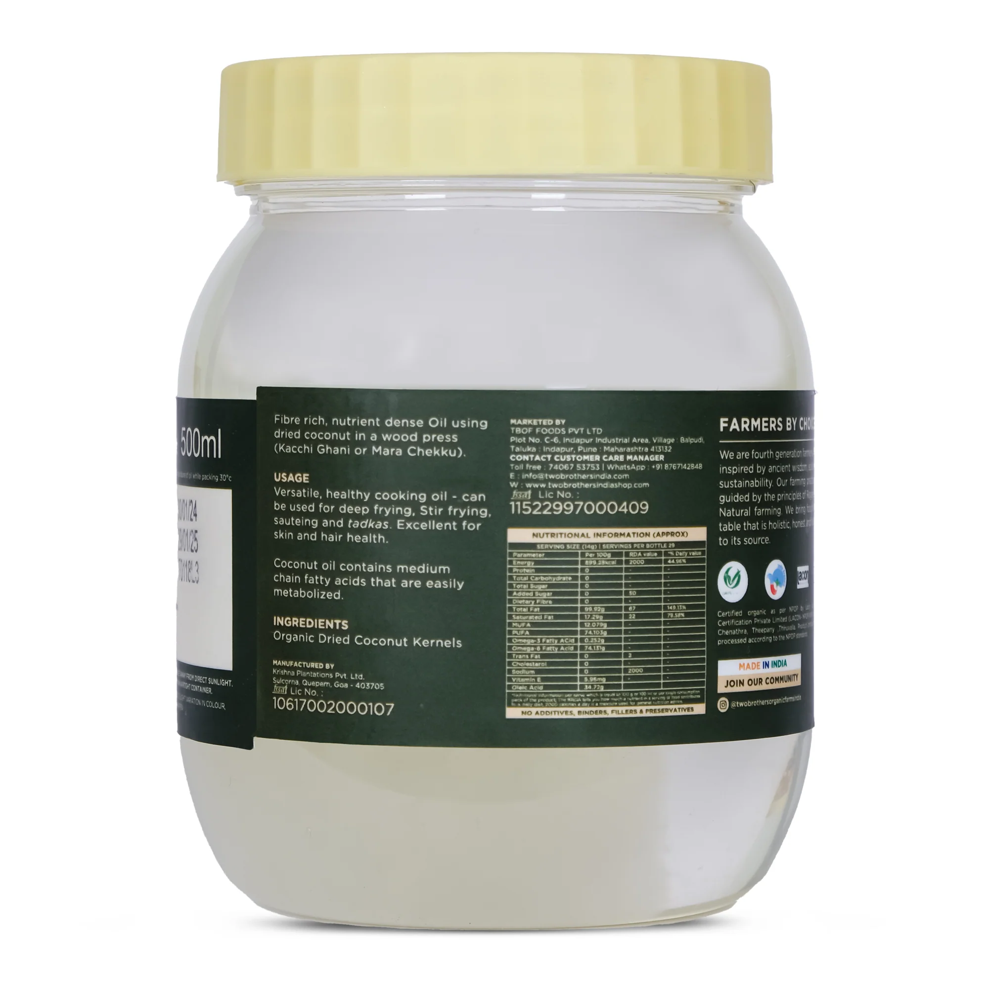 The Two Brothers Coconut Oil is Wood Pressed oil in a Kachhi Ghani or Mara Chekku using naturally dried coconut kernels.